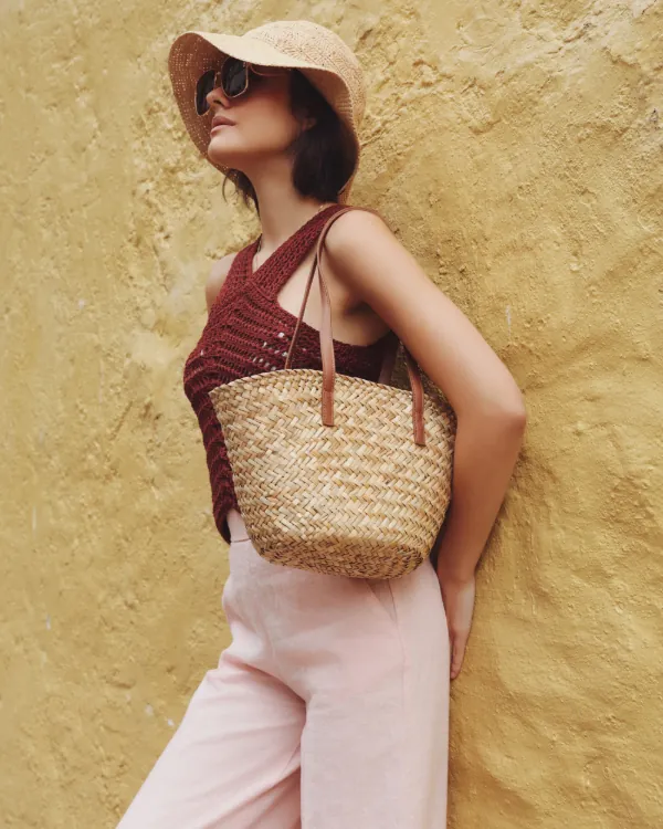 Top bez rukava od končane pletenine u boji vina prava je zvezda gradske vreline. U kombinaciji sa širokim lanenim pantalonama u puderasto roze nijansi i slamnatim šeširom – dobijamo izgled koji spaja retro šarm i savremenu lakoću. Dodajte tome pletenu torbu i oversized naočare, i spremni ste za svaki letnji dan – od jutarnje kafe u omiljenom kafiću, do večernje šetnje uz reku.