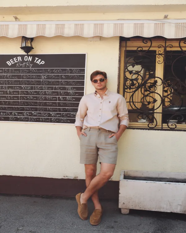 Muška letnja moda konačno dobija pažnju koju zaslužuje. Lanena košulja u nežnoj bež nijansi, uz šorts u istoj ton paleti, pokazuje da je svedenost često najjači modni izraz. Mokasine u boji peska i naočare sa okruglim ramovima podižu ovu kombinaciju iz svakodnevnog u sofisticirano, bez trunke pretencioznosti.